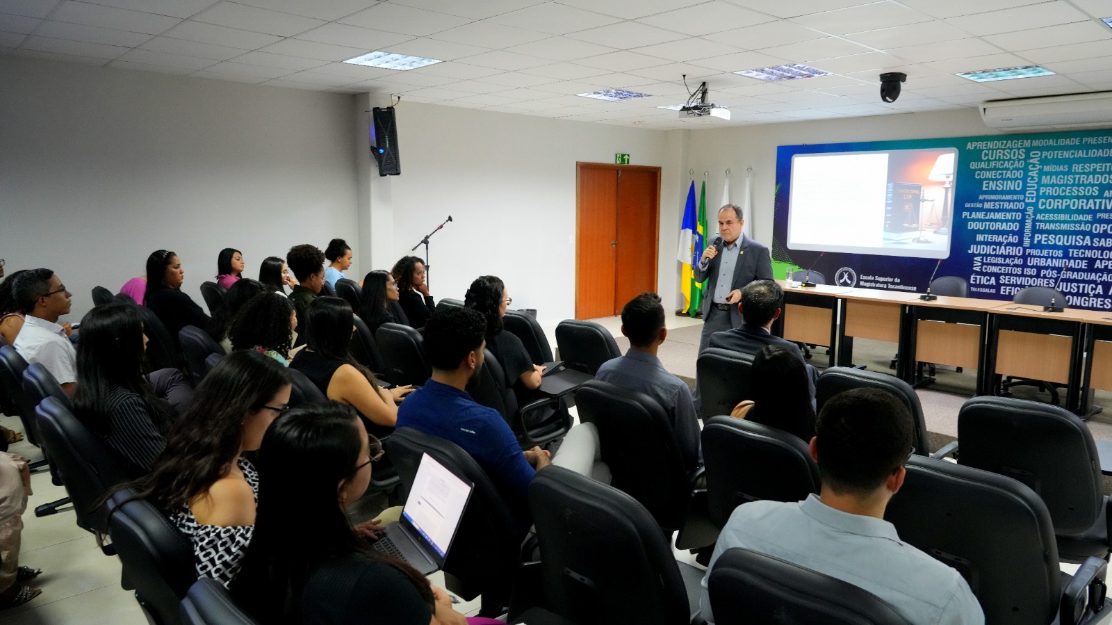 Acadêmicos(as) da Pós-Graduação Lato Sensu em Prática Judiciária promovida pela Escola Superior da Magistratura Tocantinense (Esmat) tiveram, na tarde desta quarta-feira (12/2), uma aula especial ministrada pelo desembargador Marco Villas Boas, diretor geral da Escola. Mestre em Direito Constitucional e doutor em Ciências Jurídico-Políticas, pela Faculdade de Direito da Universidade de Lisboa, e doutor em Direito Constitucional, pela PUC-Rio, o professor doutor explanou sua aula sobre Direito Constitucional. Também na ocasião, o magistrado e professor doutor Wellington Magalhães, diretor adjunto da Esmat, participou da atividade.