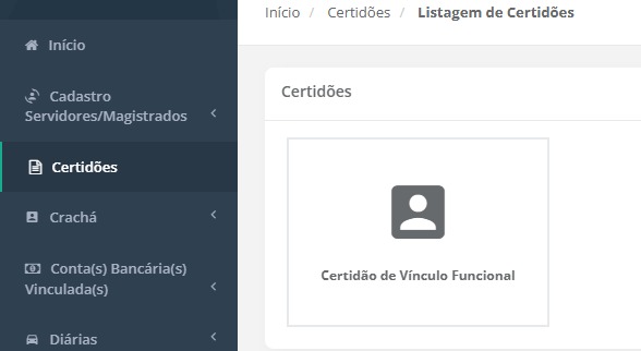 Para gerar a certidão, o(a) interessado(a) deve acessar o próprio perfil no sistema e, no menu lateral esquerdo, clicar em Certidões, selecionar Certidão de Vínculo Funcional, clicar em Gerar nova declaração de vínculo e, por fim, fazer o download do arquivo pelo botão disponível no lado direito da tela.