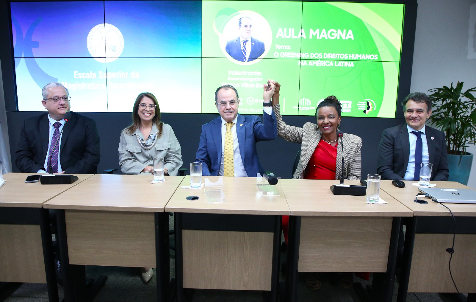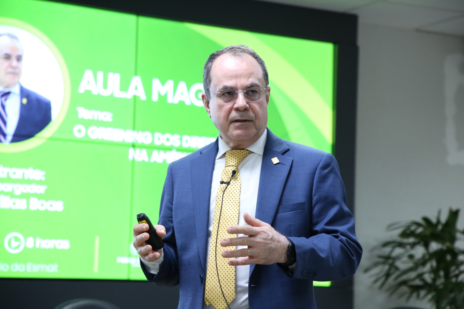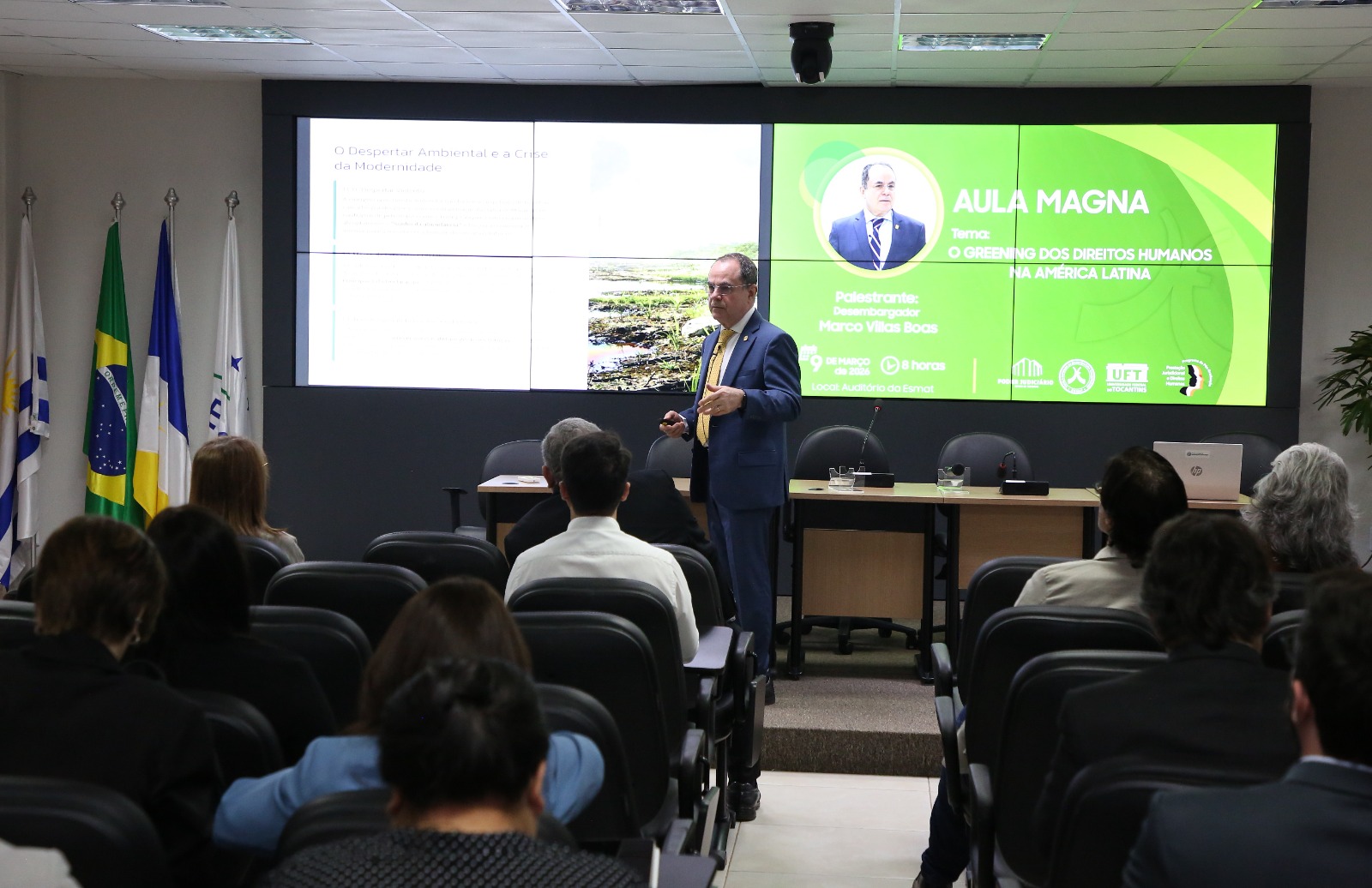 Na sequência, o desembargador Marco Villas Boas proferiu a Aula Magna com o tema “O “greening” da jurisprudência da Corte Interamericana de Direitos Humanos”. Durante a exposição, abordou o avanço da proteção ambiental no sistema interamericano de direitos humanos e a consolidação do meio ambiente saudável como direito humano autônomo.